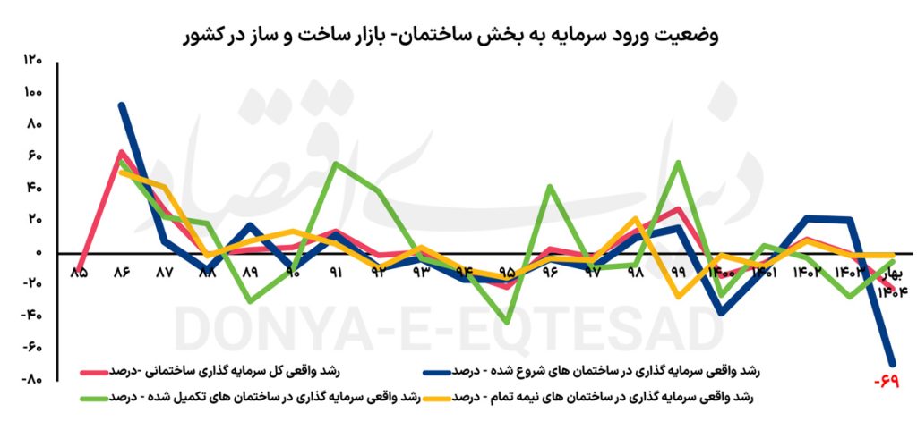 بررسیهای «دنیایاقتصاد» از واقعیت سرمایهگذاری ساختمانی در همین فصل اول سال1404 نشان میدهد، با توجه به تورم تولید حدود 45درصدی ناشی از فقط دو فاکتور «مصالحساختمانی» و «دستمزد کارگر و نیرویکار خدمات ساخت»، حجم سرمایهگذاری در «پروژههای تازه» یا همان «شروع پروژه ساختمانی» به لحاظ رشد واقعی، پساز کسر تورم، 69درصد افت کردهاست. این بهمعنای آن است که ابعاد واقعی سرمایهگذاریهای ساختمانی نسبت به سالقبل، به شکل قابلتوجهی کوچک شدهاست. این میزان رشد واقعی منفی در «سرمایهگذاریها برای ایجاد ساختمان تازه»، دستکم از سال86 تاکنون، «بیسابقه» است که البته با توجه به «ریسکهای کمسابقه» موجود در مسیر سرمایهگذاریهای مولد، چنین سقوطی از بازار ساختمان، معنادار میتواند باشد.